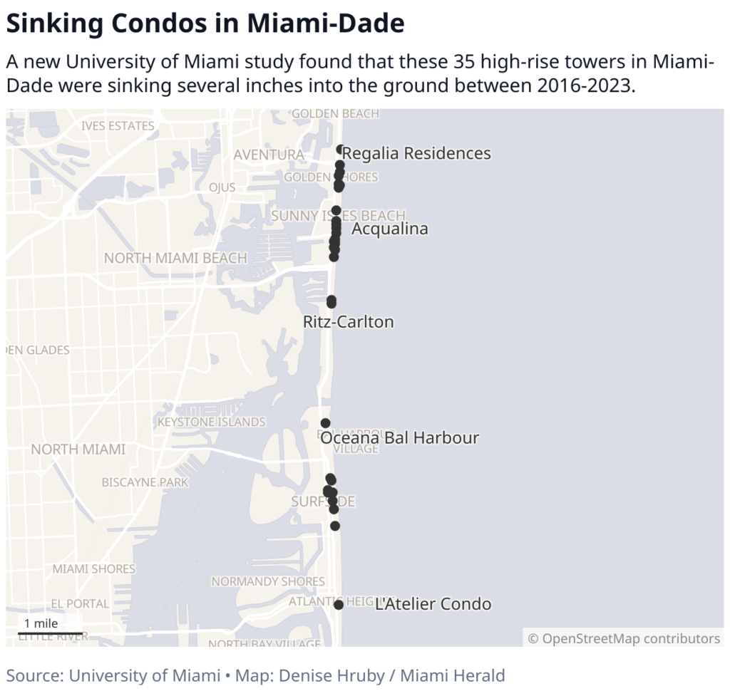 A new University of Miami study found that these 35 high-rise towers in Miami-Dade were sinking several inches into the ground between 2016-2023.